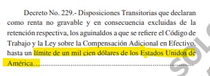 Disposiciones Transitorias que declaran como renta no gravable y en consecuencia excluidas de la retención respectiva, los aguinaldos a que se refiere el Código de Trabajo y la Ley sobre la Compensación Adicional en Efectivo, hasta un límite de un mil cien dólares de los Estados Unidos de América.