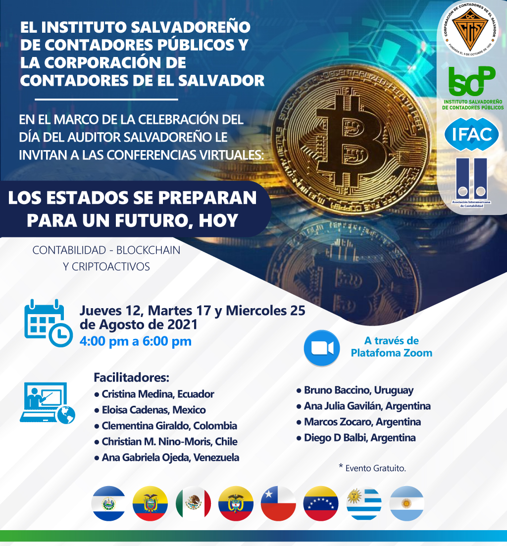 Estimados profesionales el ISCP y la CCS te invitan a participar en las Conferencias Virtuales "Los Estados se Preparan para un Futuro, Hoy" en el marco de la celebración del Auditor Salvadoreño este 12, 17 y 25 de agosto para conocer sobre la trazabilidad, contabilidad, control e impacto del uso de Criptoactivos desde la experiencia de LATAM.