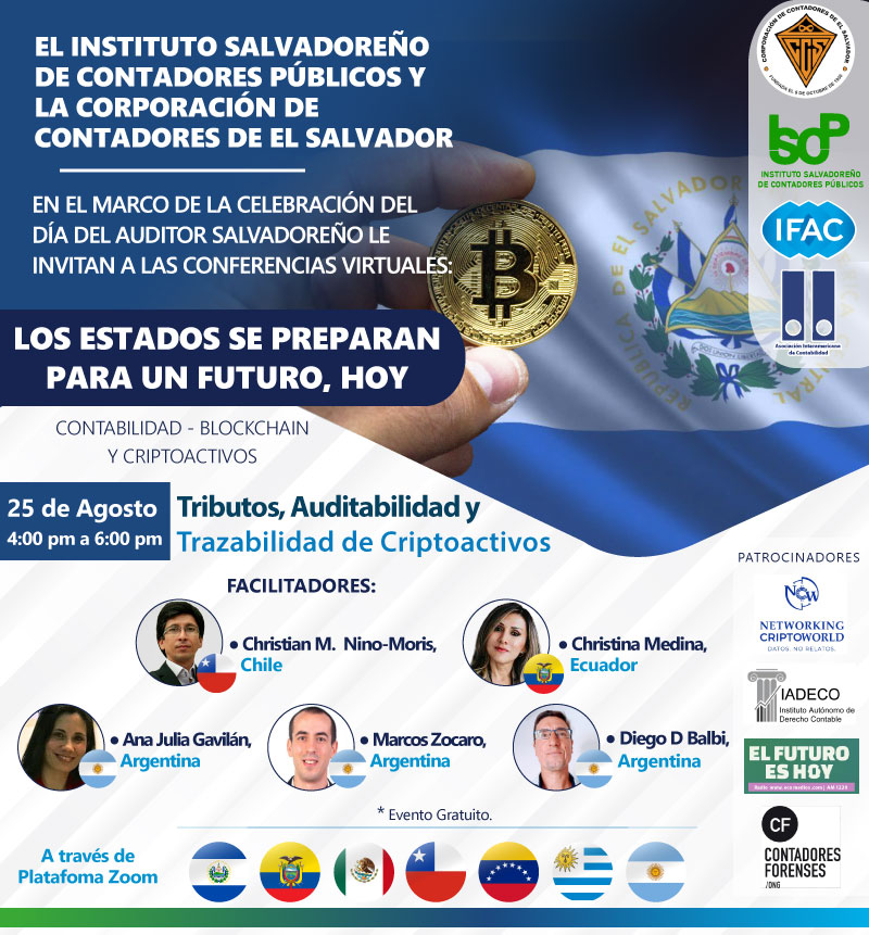 Estimados profesionales el ISCP y la CCES te invitan a participar en las Conferencias Virtuales "Los Estados se Preparan para un Futuro, Hoy" en el marco de la celebración del auditor salvadoreño este 25 de agosto para conocer sobre la trazabilidad, contabilidad, control e impacto del uso de Criptoactivos desde la experiencia de LATAM.