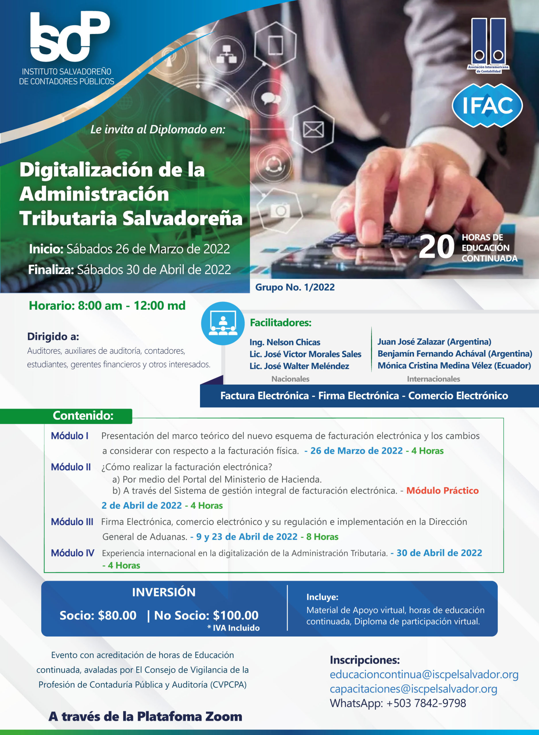 El ISCP te invita a participar en el "Diplomado Digitalización de la Administración Tributaria Salvadoreña" y prepárate para los próximos cambios entre ellos Facturación Electrónica - Firma Electrónica y Comercio Electrónico. Además nos acompañarán desde Argentina y Ecuador para hablarnos sobre su experiencias en este proceso de digitalización.