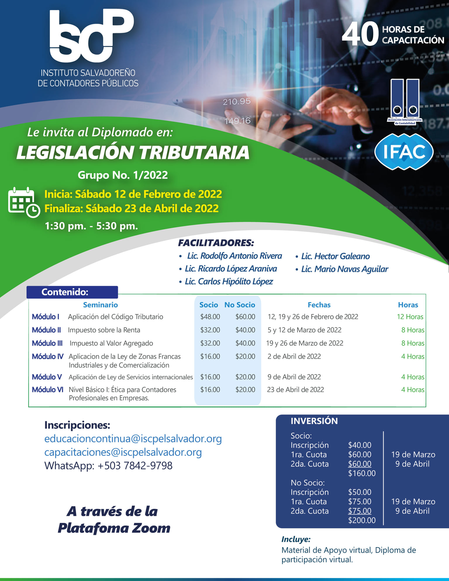 El ISCP te invita a participar en el "Diplomado en Legislación Tributaria" en el cual abordaremos Codigo Tributario, Ley de Impuesto sobre la Renta, Ley de IVA, Ley de Zonas Francas, Ley de Servicios Internacionales y Ética para los profesionales de la contabilidad.