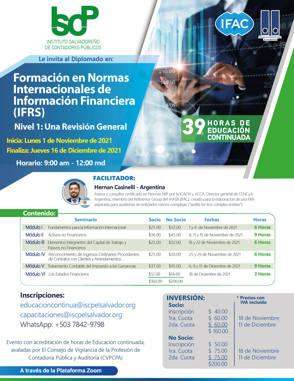 El Instituto Salvadoreño de Contadores Públicos te invita a participar en el Diplomado "Formación en Normas Internacionales de Información Financiera (IFRS) que te permitirá obtener una visión general de las Normas en su versión 2021.
