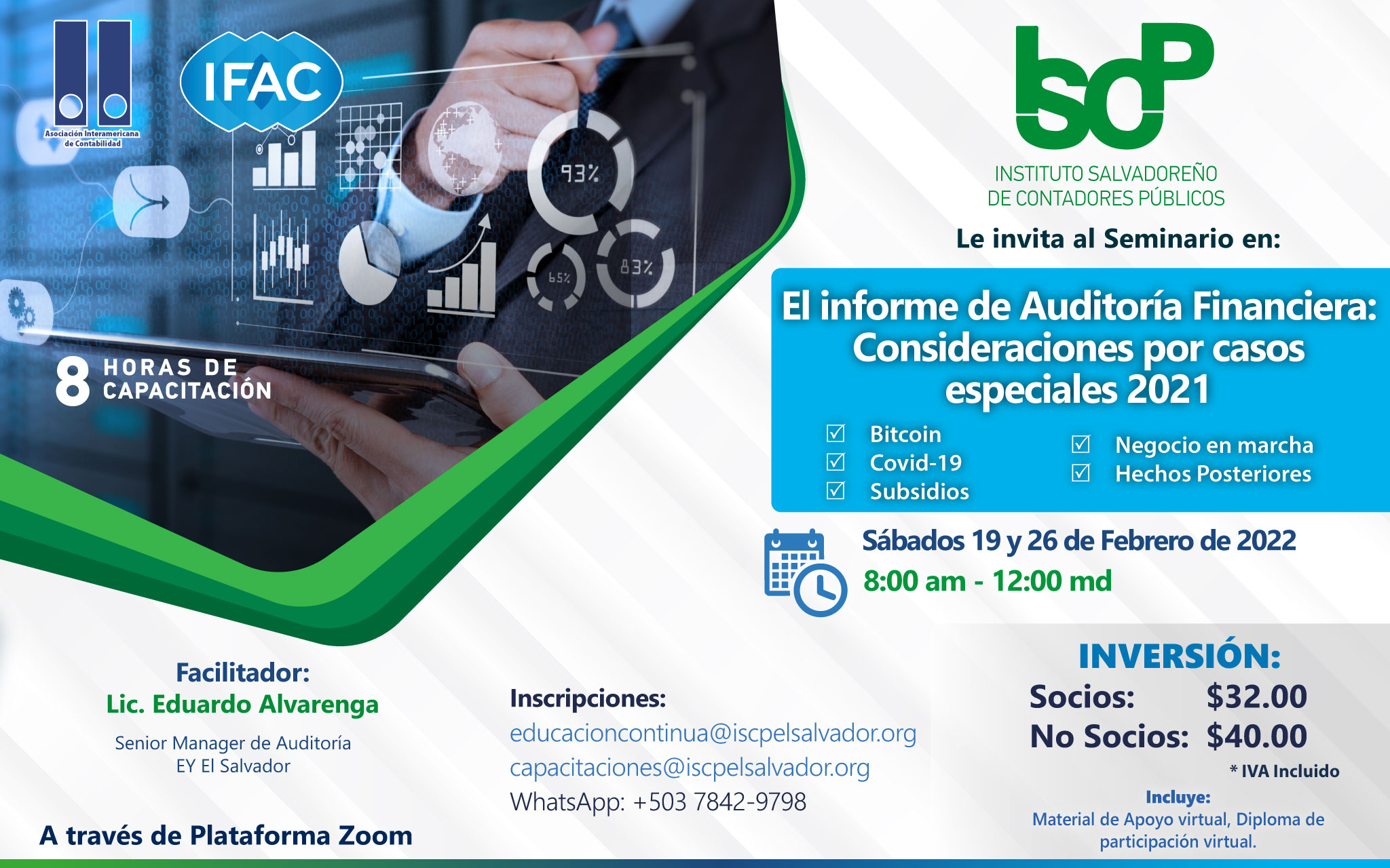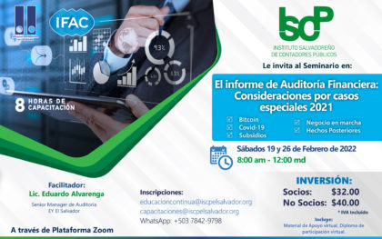 Es momento de preparar el informe de auditoría financiera para el periodo 2021; pero ¿Qué consideraciones debo tomar en cuenta por los efectos de la continuidad de la pandemia de Covid-19, uso del bitcoin u otras criptomonedas, su impacto en la continuidad del negocio y otros hechos posteriores al cierre, que sean relevantes? conoce estos y otros temas participando en el seminario "El informe de Auditoría Financiera: Consideraciones por casos especiales 2021"