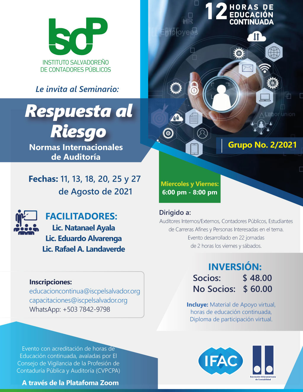 Envía comprobante de depósito al correo electrónico capacitaciones@iscpelsalvador.org - educacioncontinua@iscpelsalvador.org o al whatsapp 7842-9798.