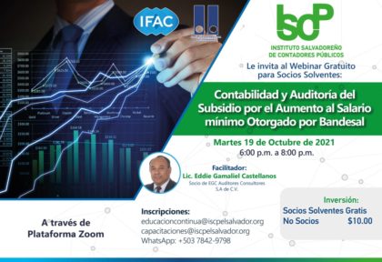 El ISCP te invita a participar en el seminario gratuito para socios “Contabilidad y Auditoría del Subsidio por el Aumento al Salario mínimo Otorgado por BANDESAL” para conocer el tratamiento contable según Normas Internacionales de Información Financiera