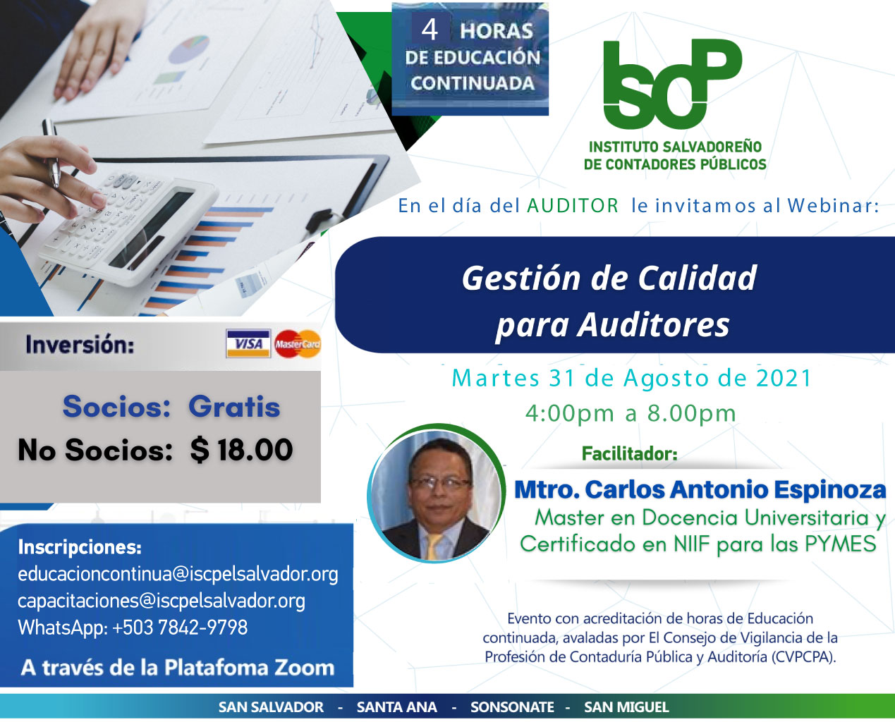 ✅ Celebra con nosotros este 31 de agosto el día del auditor salvadoreño, participando en el seminario gratuito para socios solventes "Gestión de Calidad para Auditores".