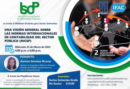 El ISCP te invita a participar en el primer seminario gratuito para socios de la serie, con el tema “Una Visión General sobre las Normas Internacionales de Contabilidad del Sector Público (NICSP)” y conoce sobre el reto que asumió la Dirección General de Contabilidad Gubernamental (DGCG), para implementar las NICSP en El Salvador; además conocerás la nueva plataforma digital, Pathways to Accrual , lanzada por la Federación Internacional de Contadores (IFAC)