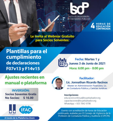 Estimado socio te invitamos a participar en el seminario gratuito para socios solventes “Plantillas para el cumplimiento de declaraciones F07v13 y F14v15” para conocer los ajustes recientes en manuales y plataforma que permitan proporcionarte las herramientas para realizar tú trabajo de una forma más fácil
