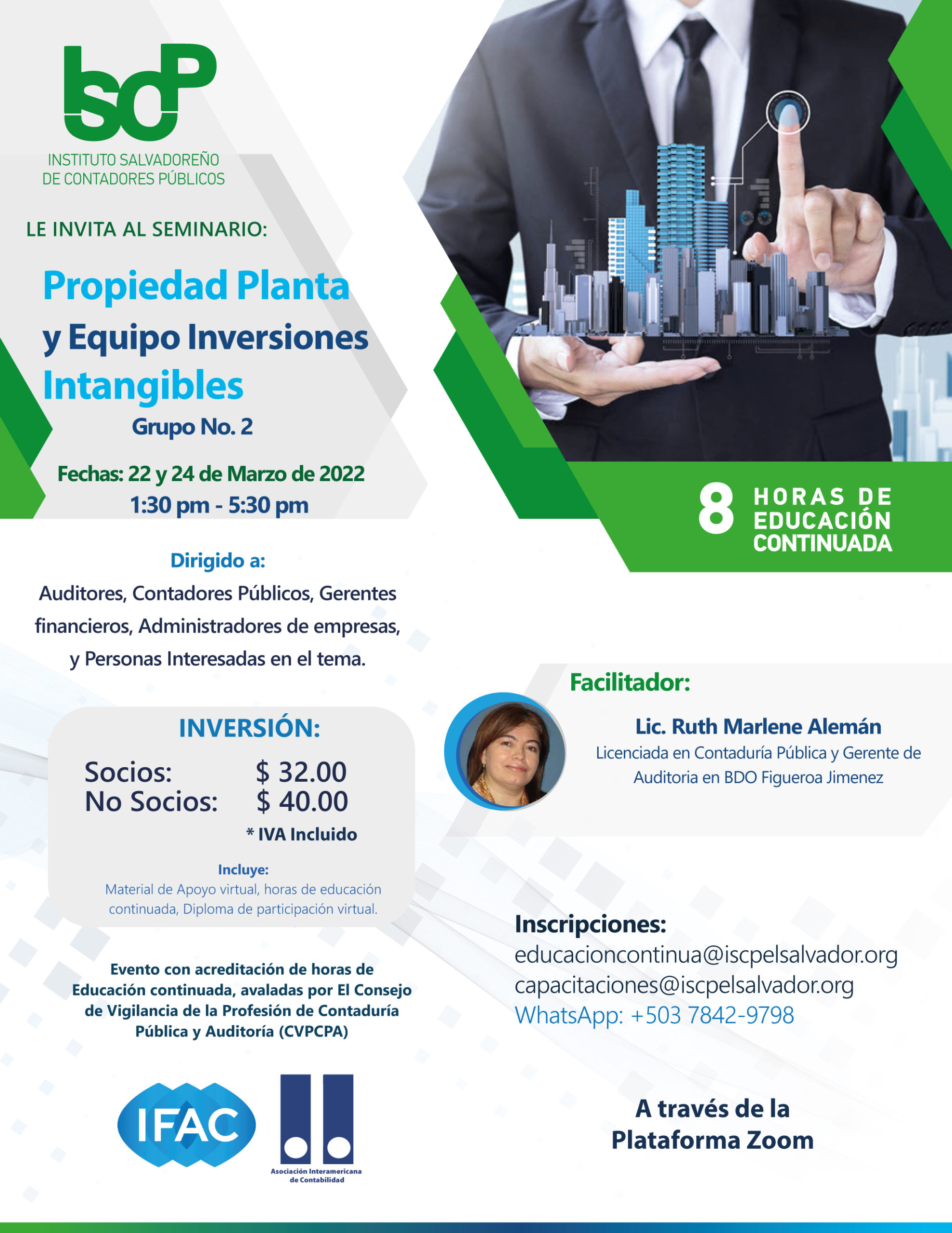 El ISCP te invita a participar en el Seminario "Propiedad, planta y equipo/Inversiones/Intangibles con base en NIIF - PYMES - G2-2022"